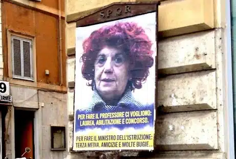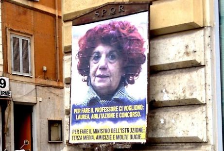 La polemica a quanto pare non è finita, lo dimostrano i maxi poster che sono apparsi oggi sui muri della Capitale. Oltre al faccione del ministro campeggia la scritta:”Per fare il professore ci vogliono: laurea, abilitazione e concorso. Per fare il ministro dell’Istruzione: terza media, amicizie e molte bugie ….”