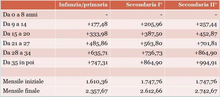 Incrementi mensili lordo dipendente in funzione dell’anzianità di servizio (docenti di ruolo), scatti di anzianità.