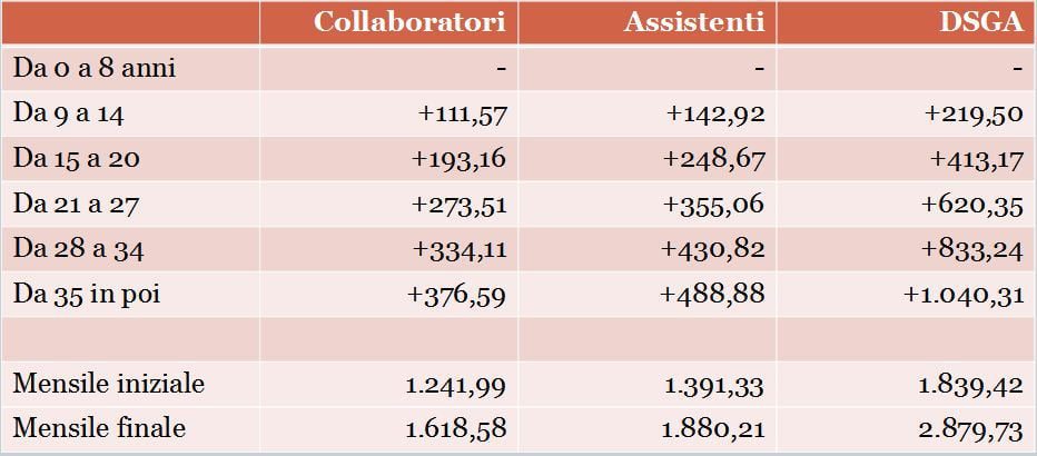 Incrementi mensili lordo dipendente in funzione dell’anzianità di servizio (ATA)
