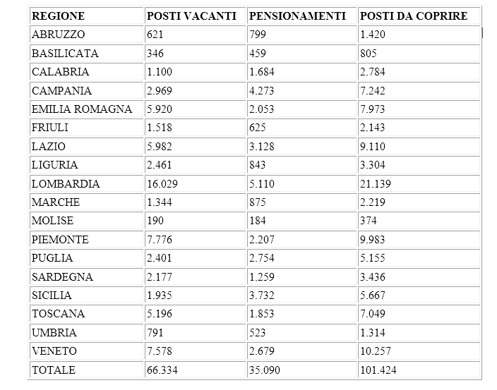 Posti diponibili per i precari della scuola anno scolastico 2021-2022, pubblichiamo una scheda completa prodotta dai sindacati contenente i posti vacanti al netto dei pensionamenti, suddivisi per regione.