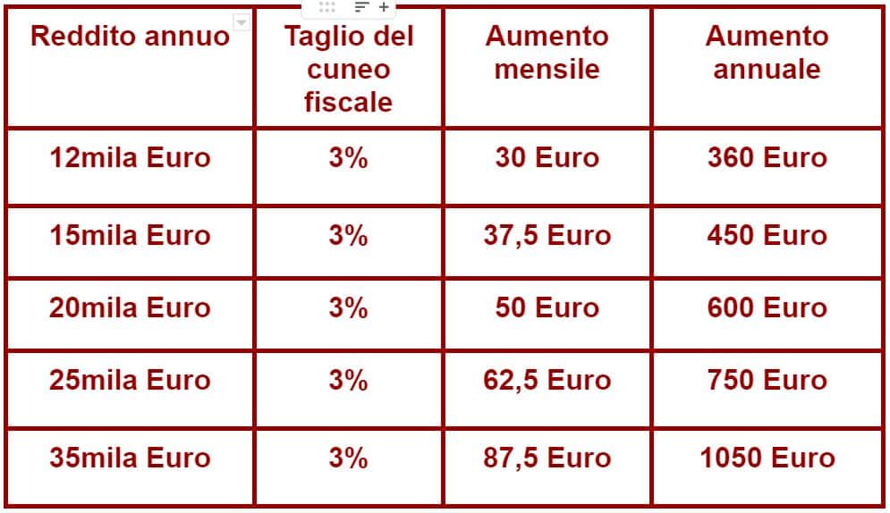 Per far capire meglio cosa produrrà il taglio del cuneo fiscale del 3% abbiamo realizzato una tabella specifica contenente gli aumenti mensili e quelli annuali.