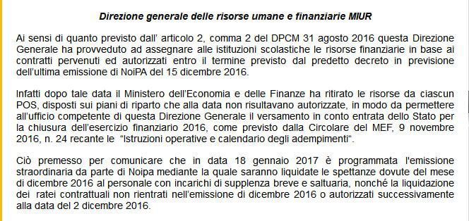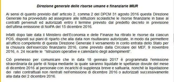 Nella nota si legge che si è “provveduto ad assegnare alle istituzioni scolastiche le risorse finanziarie in base ai contratti pervenuti ed autorizzati entro il termine previsto dal predetto decreto (DPCM 31 agosto 2016) in previsione dell’ultima emissione di NoiPA del 15 dicembre 2016.”