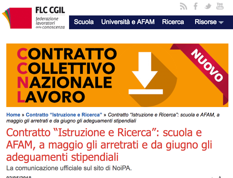 Gli arretrati relativi il rinnovo del Contratto “Istruzione e Ricerca” di scuola e AFAM, NoiPa li pagherà a maggio. A darne notizia oltre al portale del MEF è la FLC Cgil con un comunicato pubblicato sul sito nazionale. a maggio gli arretrati e da giugno gli adeguamenti stipendiali. Il sindacato scrive: “La comunicazione ufficiale sul sito di NoiPA”. A dire il vero noi non lo abbiamo trovato, ma forse abbiamo cercato male.