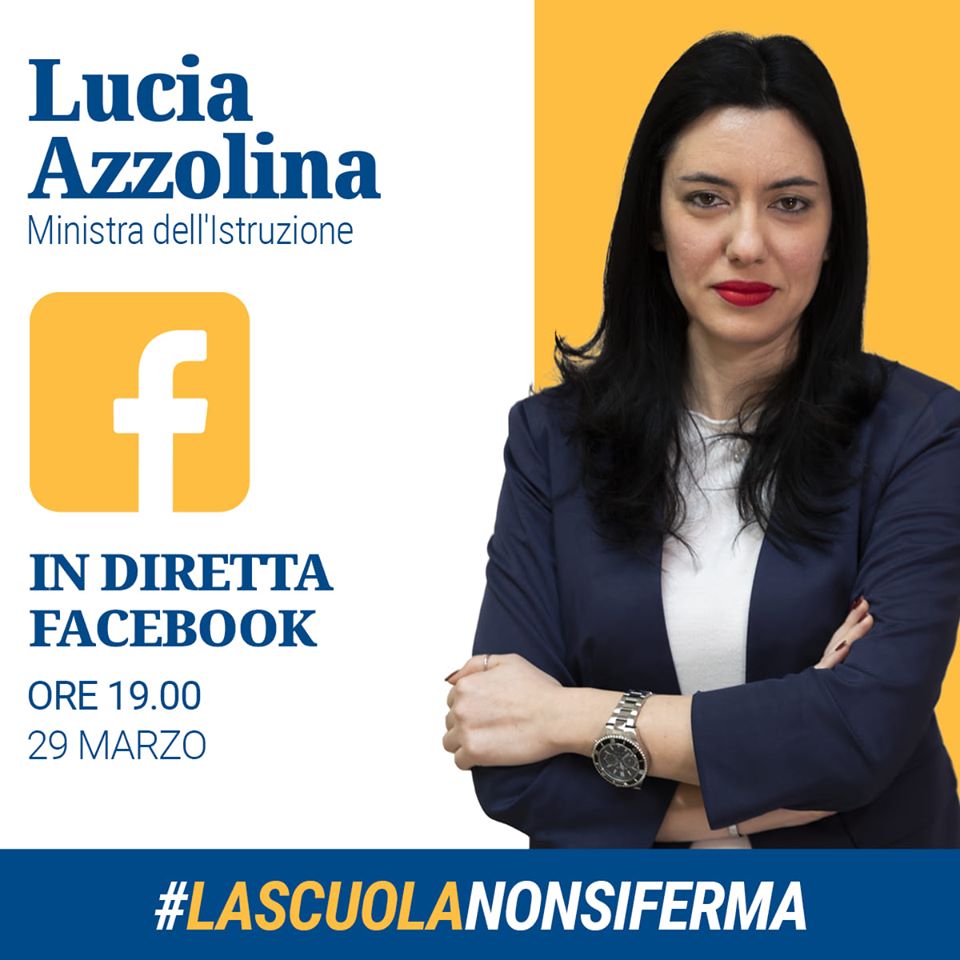 La ministra Azzolina ha annunciato che alle ore 19:00 di oggi sarà in diretta sulla propria pagina facebook: “Vi aspetto, alle 19, per fare un punto sulla gestione dell’emergenza coronavirus. E su come stiamo cercando di garantire il diritto allo studio ai nostri ragazzi”.