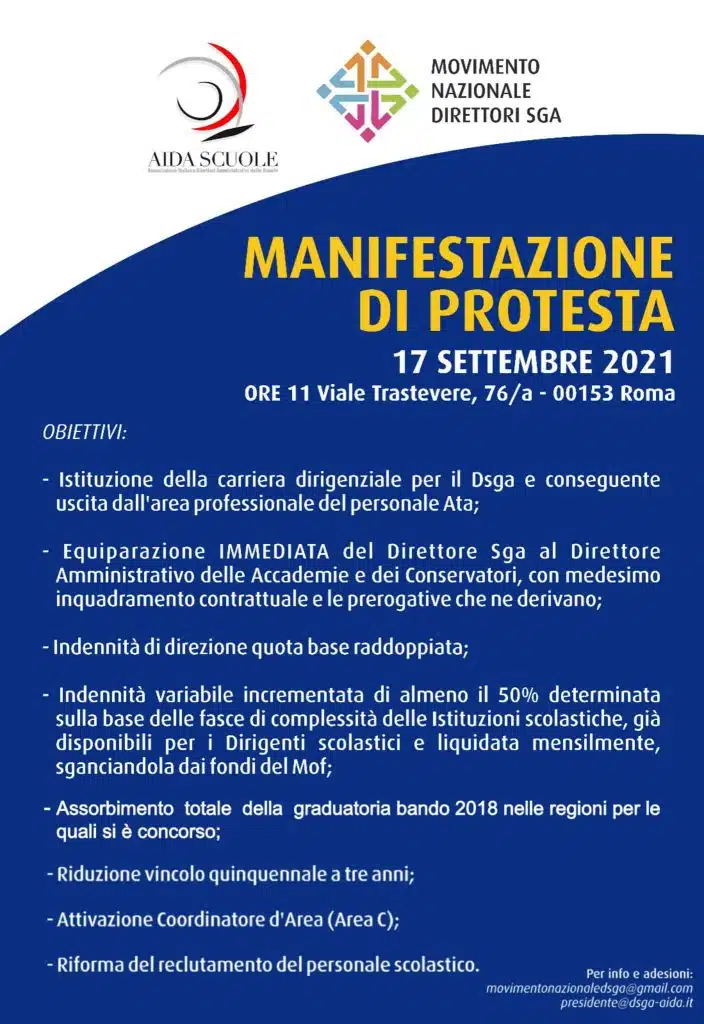 COMUNICATO STAMPA – Valorizzazione e riconoscimento della figura del Direttore SGA. Sono questi gli obiettivi della manifestazione di protesta che il MOVIMENTO NAZIONALE DIRETTORI SGA (Servizi generali e amministrativi) ed AIDA SCUOLE (Associazione Italiana Direttori Amministrativi) hanno promosso per il prossimo 17 settembre a Roma in viale Trastevere 76/a.
